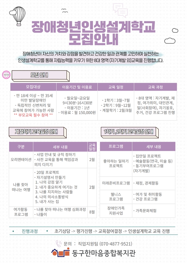 동구한마음종합복지관에서는 장애청년들을 대상으로 인생설계학교를 열고 학생들을 모집합니다.